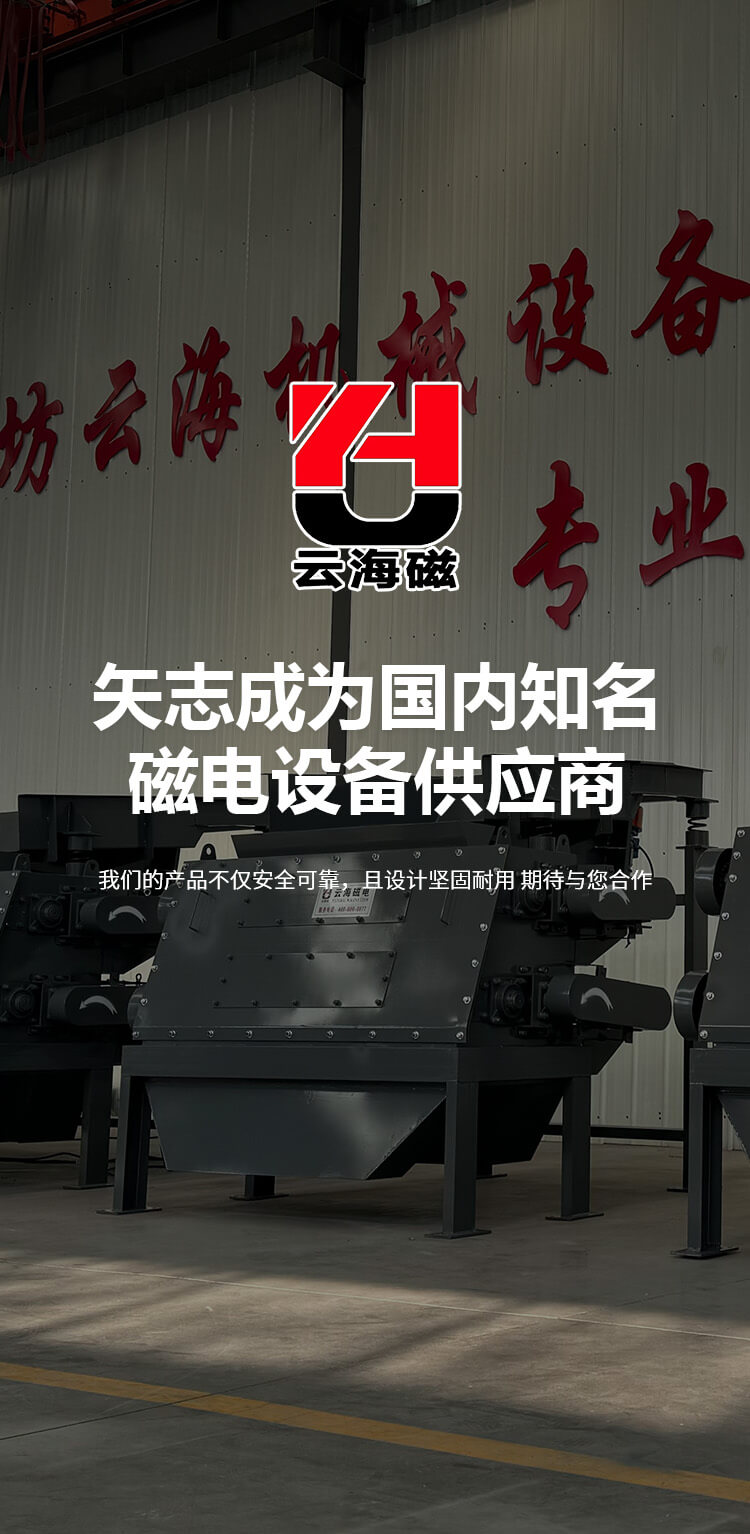 濰坊云海機械設備有限公司始建于2009年,是生產磁電機械設備的廠家。系生產建材、冶金、礦山、化工等行業微機自動化、檢測、控制專用設備的公司。主要產品工業自動化配料系統、電磁永磁除鐵器、永磁磁選機、電磁振動給料機、皮帶螺旋輸送機、電磁滾筒、破碎機、包裝機 、除塵器等系列產品。